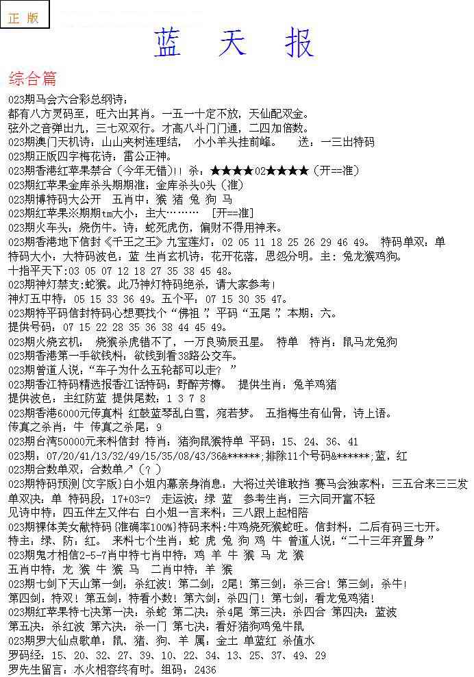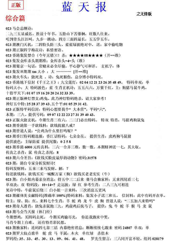 1581 精准传真报 1582 新天线宝宝内幕报 1583 当期狗仔版 1585 白姐泄密